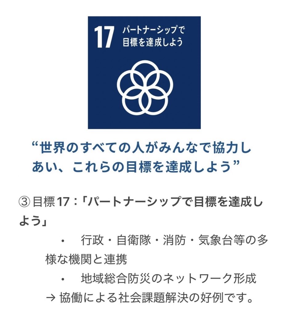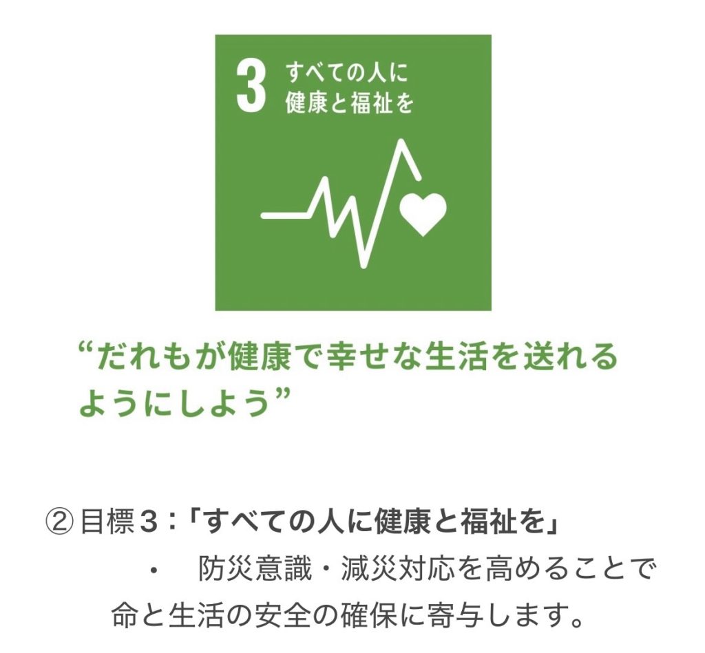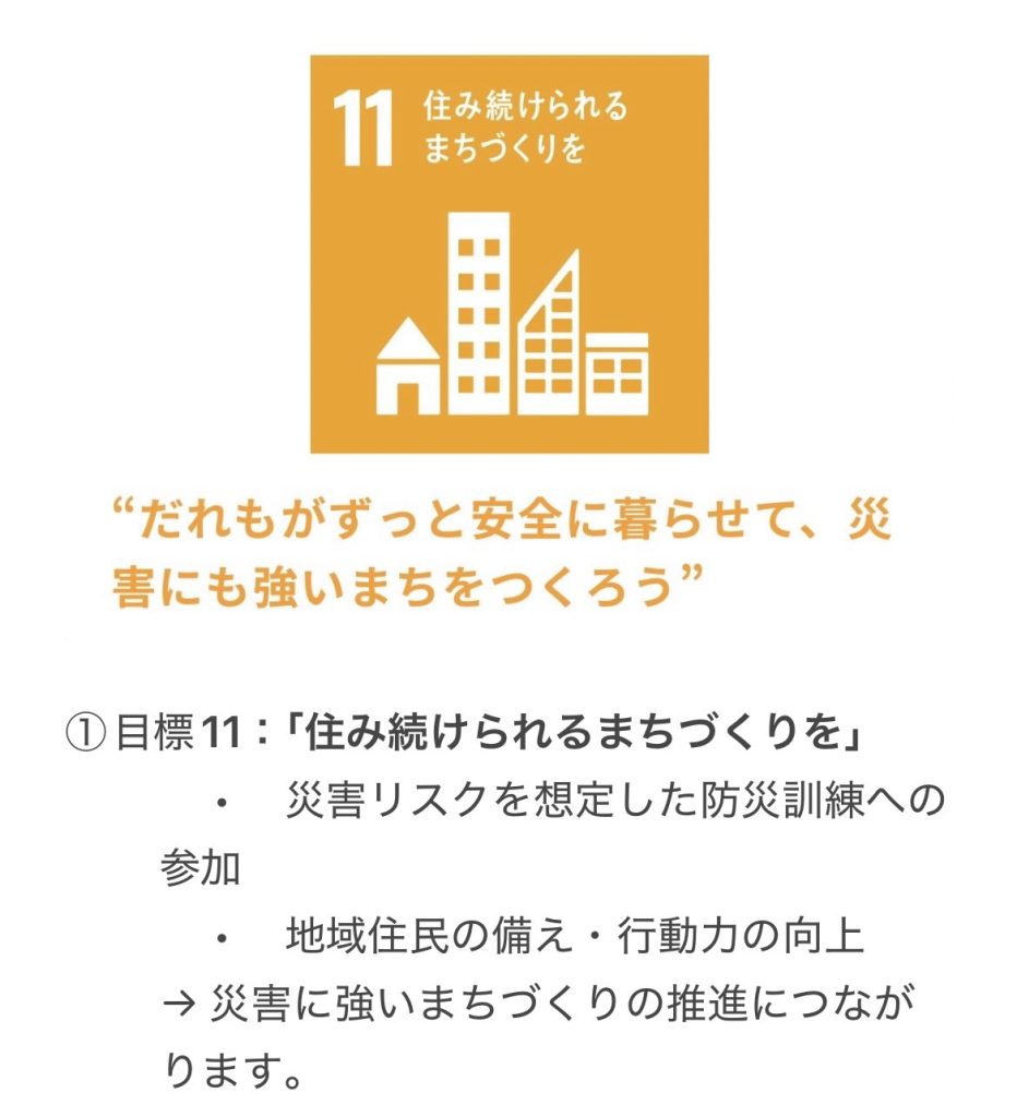 地域住民が災害に備え、命と暮らしを守る力を高める取り組みとして、SDGs目標3「健康と福祉」、目標11「住み続けられるまちづくり」、