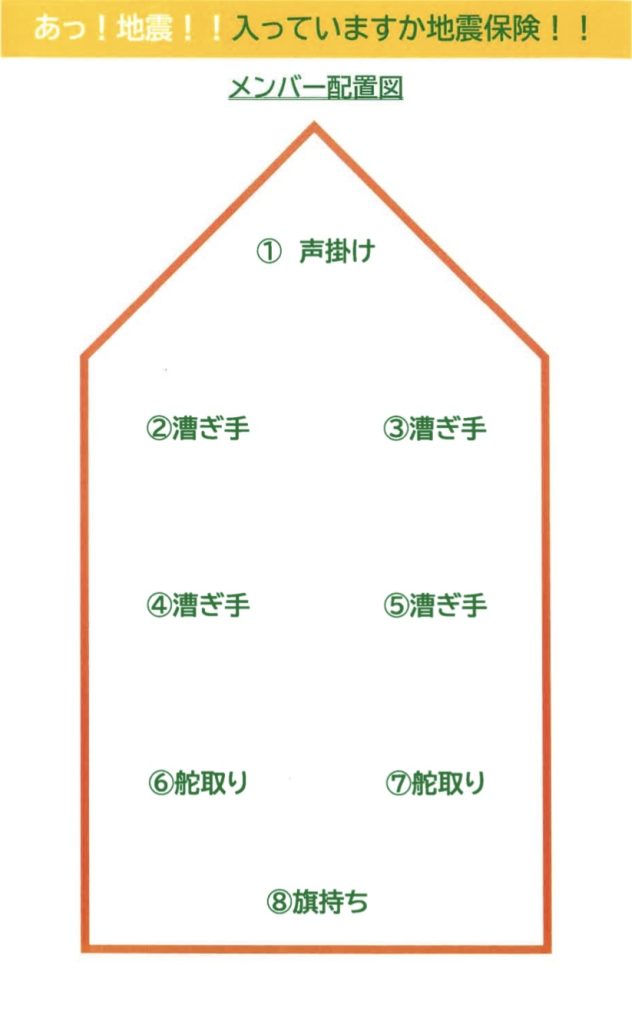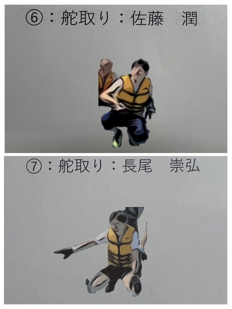 ⑥⑦後方の漕ぎ手兼舵取り(2人):後方に配置される2人は漕ぎ手としてサポートし、