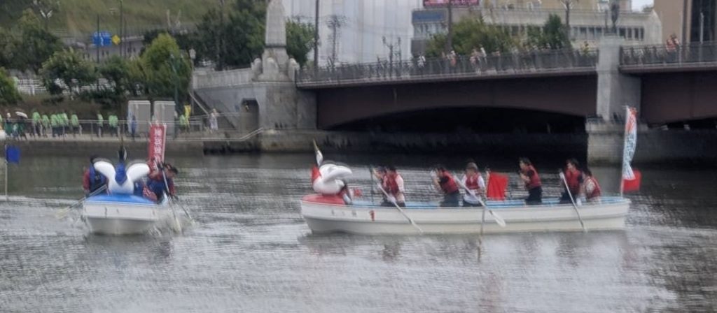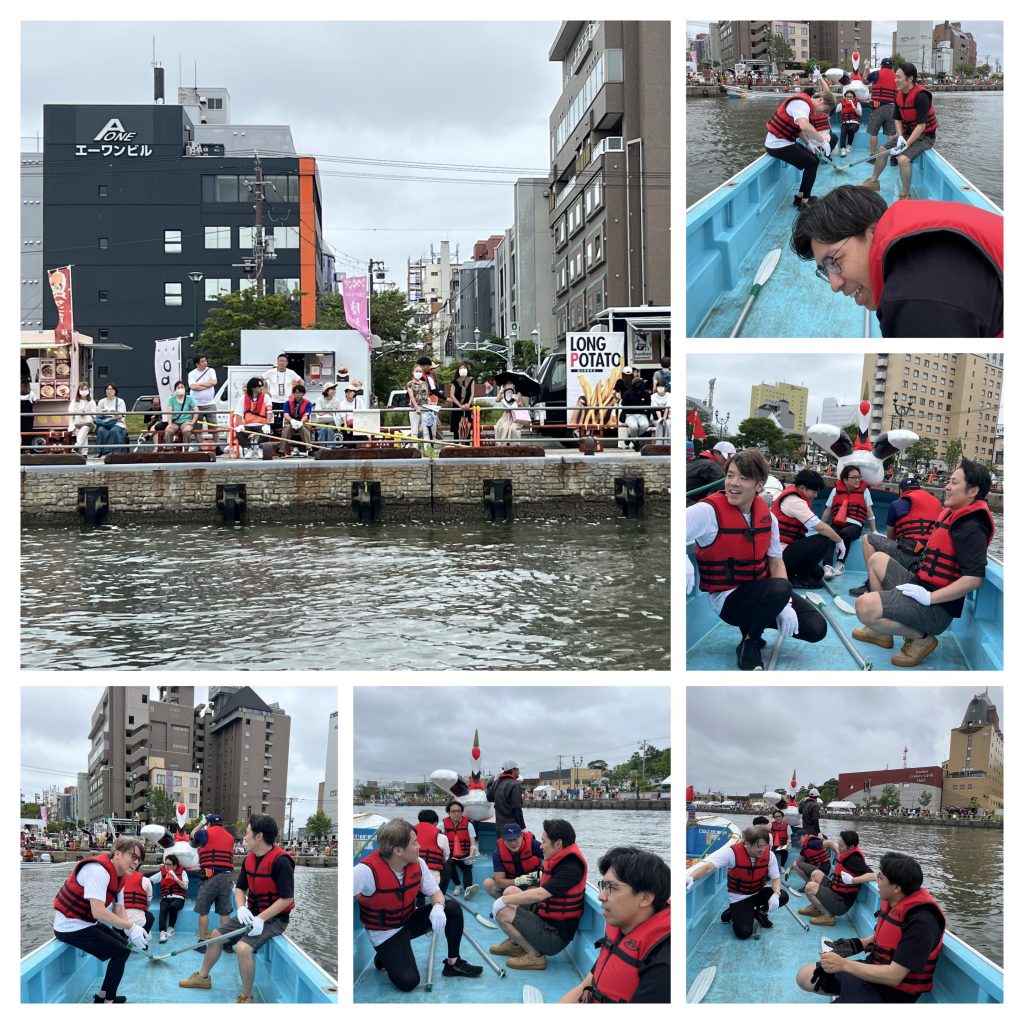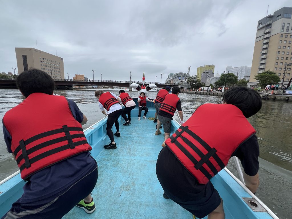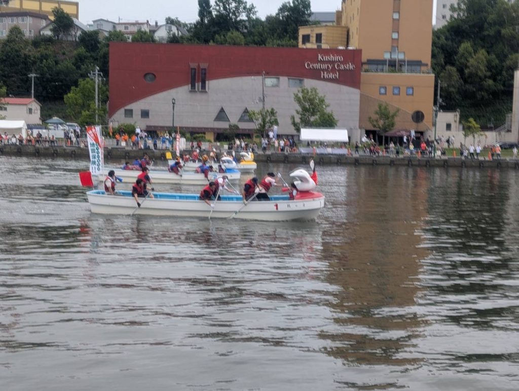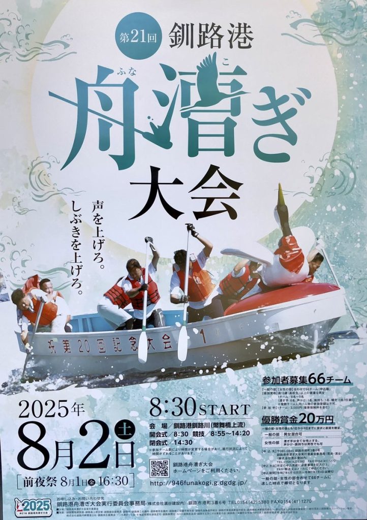 「釧路港舟漕ぎ大会」は平成17年に第1回大会を開催し、今年は21回目を迎え、釧路川を会場として80チームが参加するタイムレースであり、参加者と観客の熱気で大きな盛り上がりをみせます。