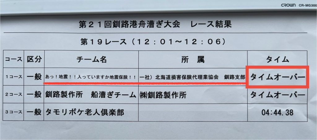 北海道代協釧路支部活動の一環として、第21回釧路港舟漕ぎ大会へ参加し、地震保険普及活動を実施いたしました。