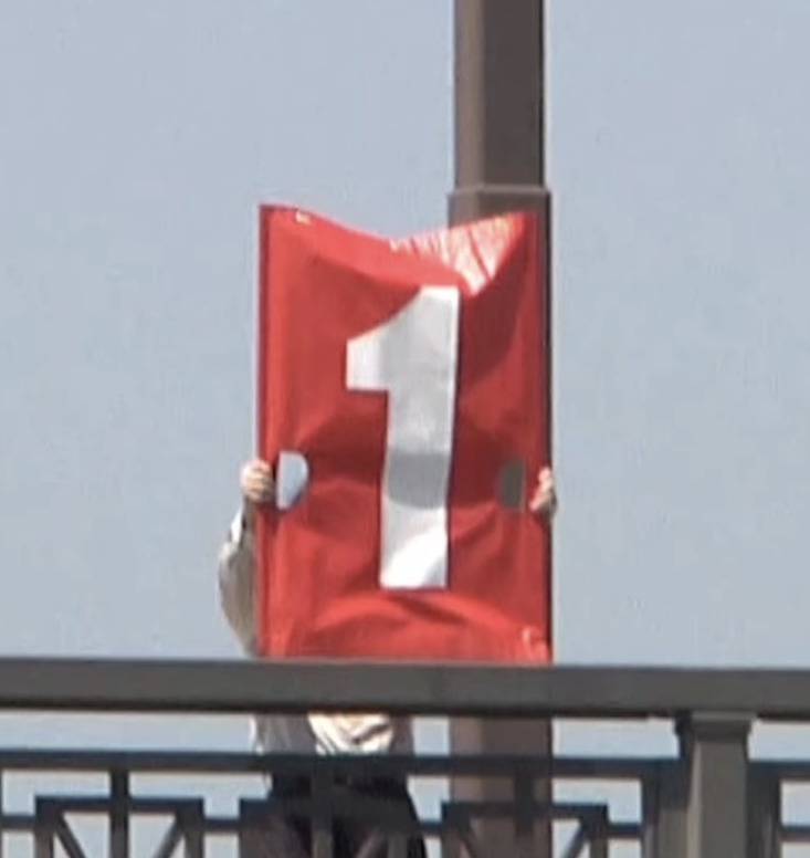 折り返しフラッグをクリアできたかどうかは、橋の上のコース別の表示で確認します。白であればクリア、赤の表示の場合は失敗です、もう一度折り返しフラッグを回る必要があります。