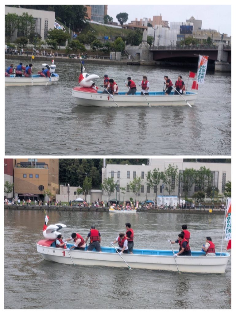 あとは難関の折り返し、回転動作のタイミングを誤ると回りすぎるなどしてしまいます。舟をUターンさせるのは、後方舵取り役2人の役目です。